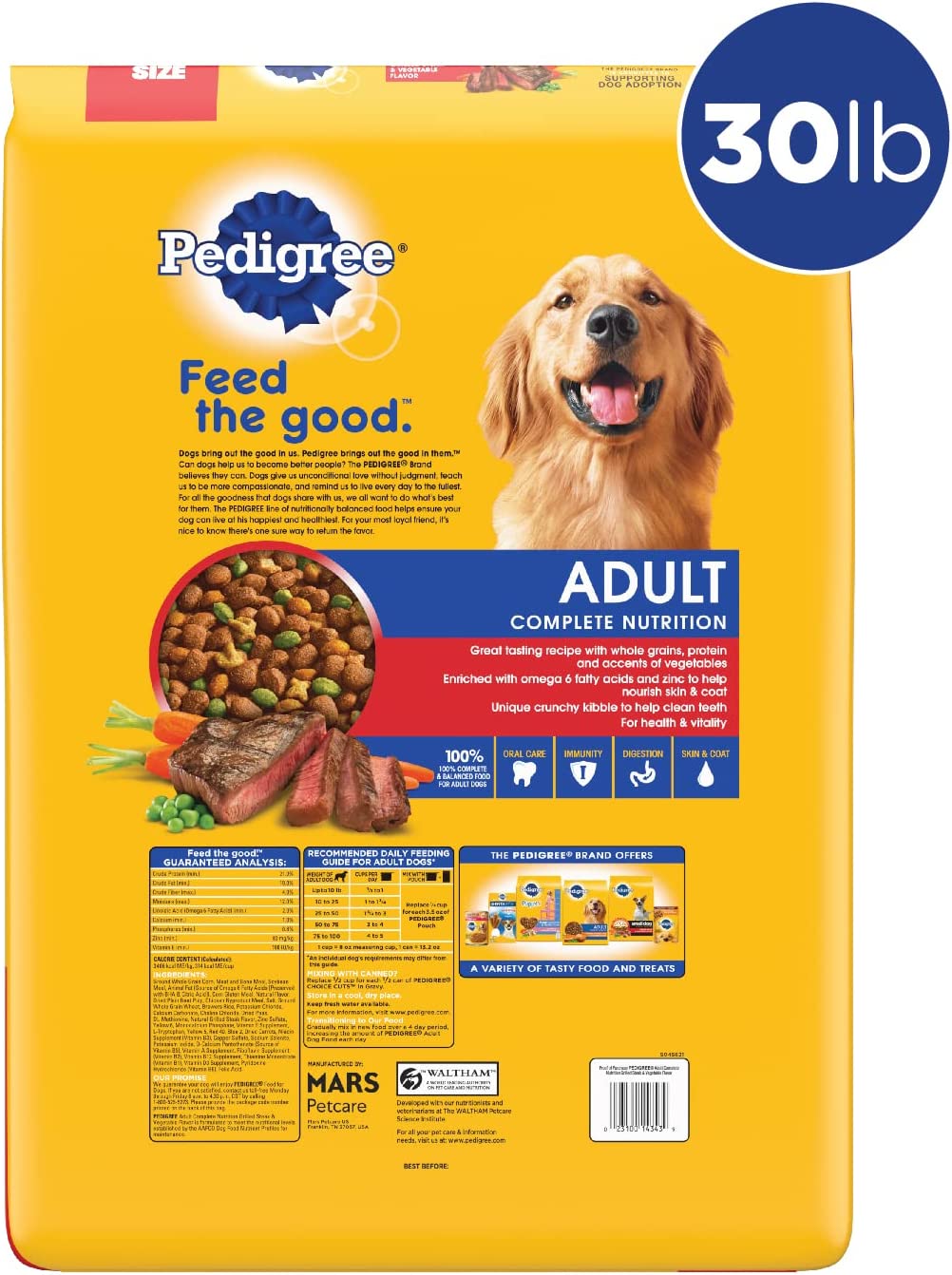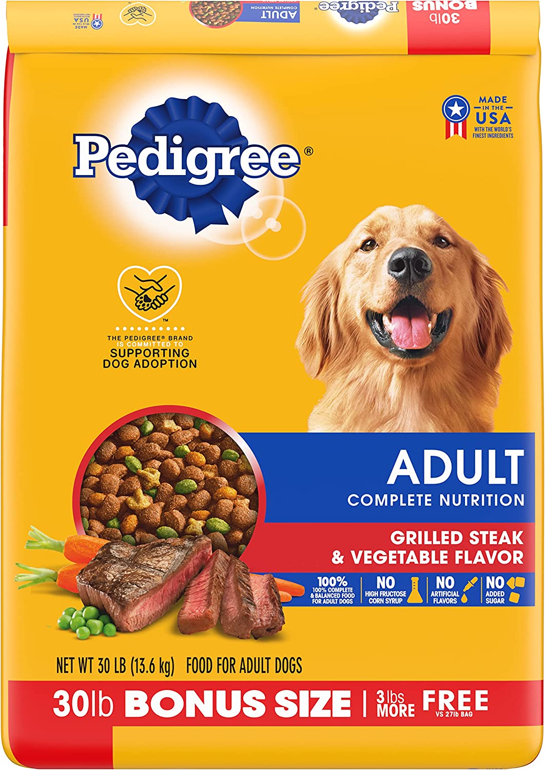 - Contains one (1) PEDIGREE Complete Nutrition Adult Dry Dog Food Grilled Steak & Vegetable Flavor Dog Kibble, 30 lb. Bonus Bag